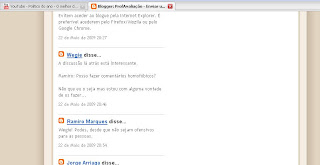 Mas já agora não vi lá também o senhor Miguel Loureiro a condenar as atitudes dos colegas. Parece-me que a falta de coragem não está do meu lado mas, lamentavelmente, do lado dos professores. Mas também percebo que, quem se atreva a falar contra os seus colegas será imediatamente reprimido e insultado pelos restantes. Falam do governo, da sociedade mas esquecem-se de olhar para eles mesmos. Tanta ideologia politica criticada e no fundo seguem as mesmas linhas da filosofia do medo tão presentes no Fascismo e regimes Comunistas outrora presentes na Europa...